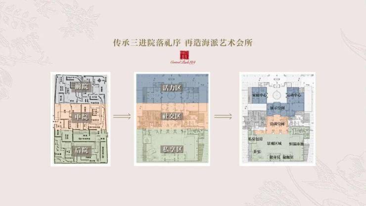 中建·玖上琅宸的会所的格局设计灵感来自于中国古典居住的三进院落,以活力区、社交区、私享区对应前院、中院、后院,真正做到了活动动线分明,移步一景。