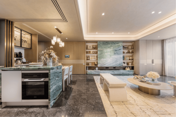 空间内天然奢石被大量运用于关键界面,例如客厅的背景墙面、餐桌的台面或是卫生间的墙面,彰显出不凡的品味。