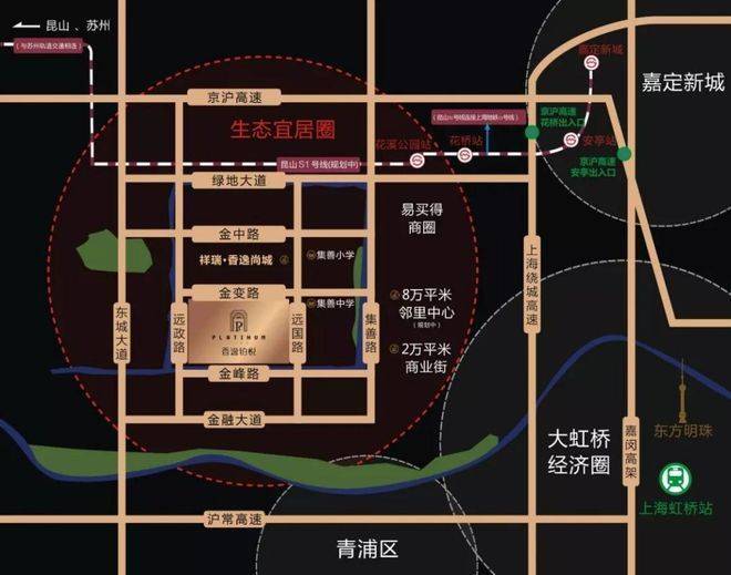 香逸铂悦位于苏州市昆山市花桥镇。项目位于大虹桥生活圈双轨交汇地,轨道交通上海11号线及苏州11号线无缝链接沪昆苏跨省交通脉络,畅享大时代下的大虹桥都市圈核心地。低密度的宜居环境,高度集合的生活配套,成功为业主营造了一个高效、高便捷、高智能的综合生活区。
