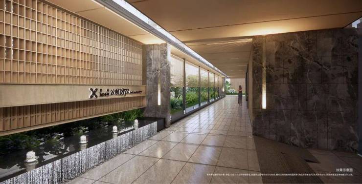 织影连廊 泛域大堂:顶部采用造型铝板,地面采用仿石砖,格栅屏风搭配金属幕帘,入口处采用大理石墙面,彰显质感,搭配屏风下花岗岩组合的水景,共同营造低调内敛的品质感;