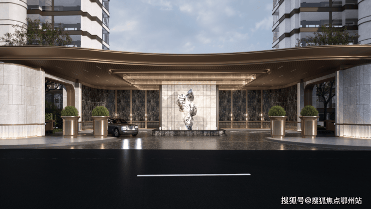 挑高金属雨棚采用极细边,中间凿壁采用透光奢石,搭配极具现代主义的雕塑彰显小区档次,背景墙面采用维多利亚黑大理石,奢华且低调.