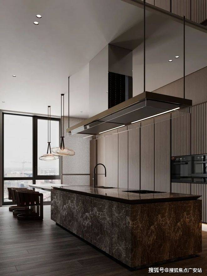 整个餐厅的墙壁和天花板全部使用可视镜作为装饰,把客厅和餐厅的风景全部融合在一起,餐厅的餐桌和大理石岛台完全烘托出现代的氛围感。
