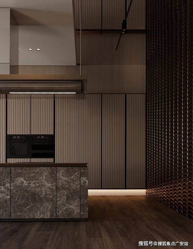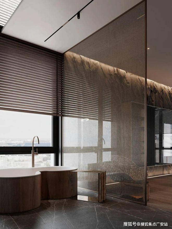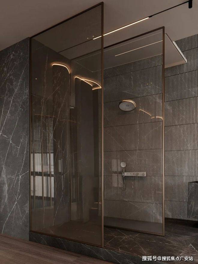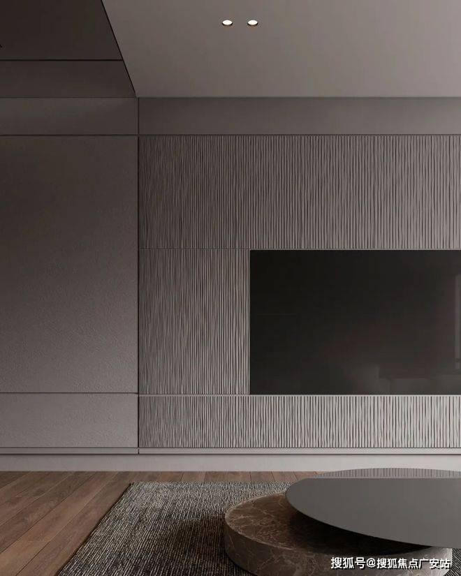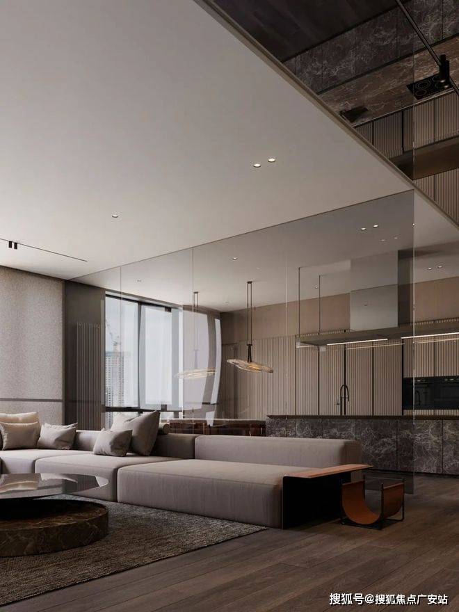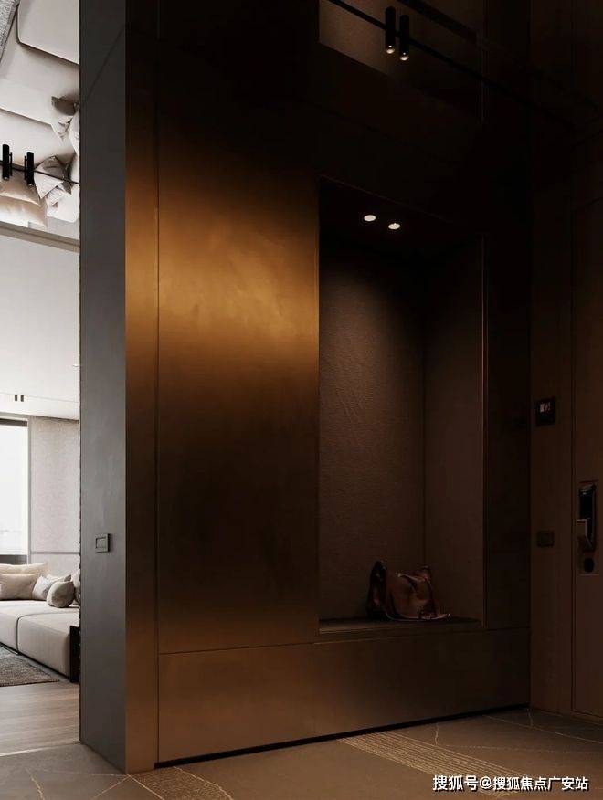 深色的玄关加上深灰色的墙面,让整个空间变得神秘又迷人。暗黄色的灯光给整个空间带来一丝神秘,客厅的视野完全被落地窗全部打开,整个空间显得通透大气。