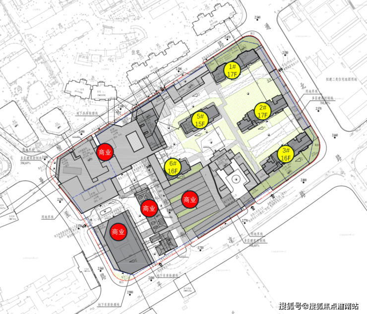 根据设计方案显示,地块拟建5幢15~17F高层住宅及大规模商业建筑。
