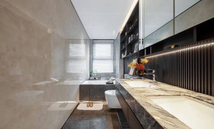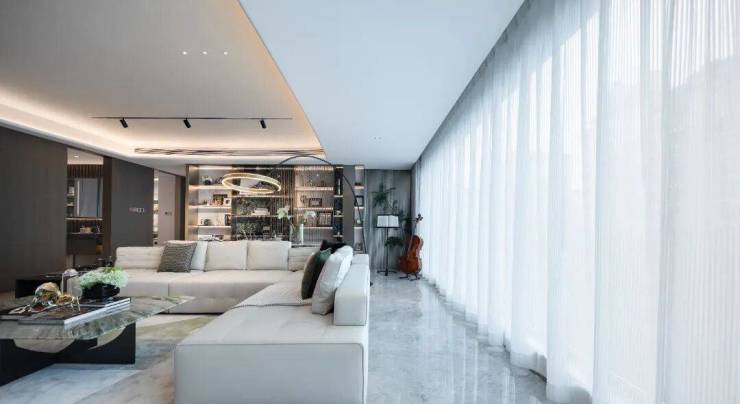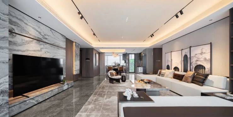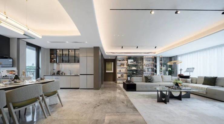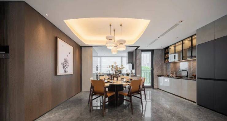 对于承载更多家庭场景的公共空间处理,檀府也很用心。将客厅、餐厅、南北阳台三个空间一字排开,形成更为阔绰的场域。这样的设计,不仅能有效增强室内视野的开阔、通风采风,同时还能打造一个自在阔绰的通厅,可作为家庭社交主场。