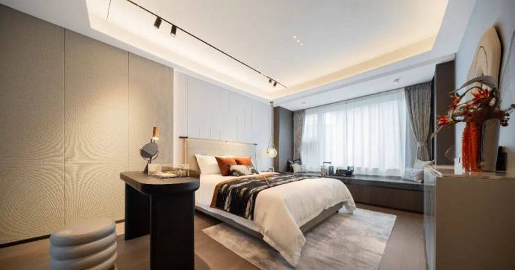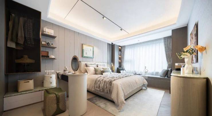 至于主卧则是套房设计。南向超大观景飘窗+梳妆区+步入式衣帽间+独立卫浴,充分满足家主的居住尊崇感和私密感。