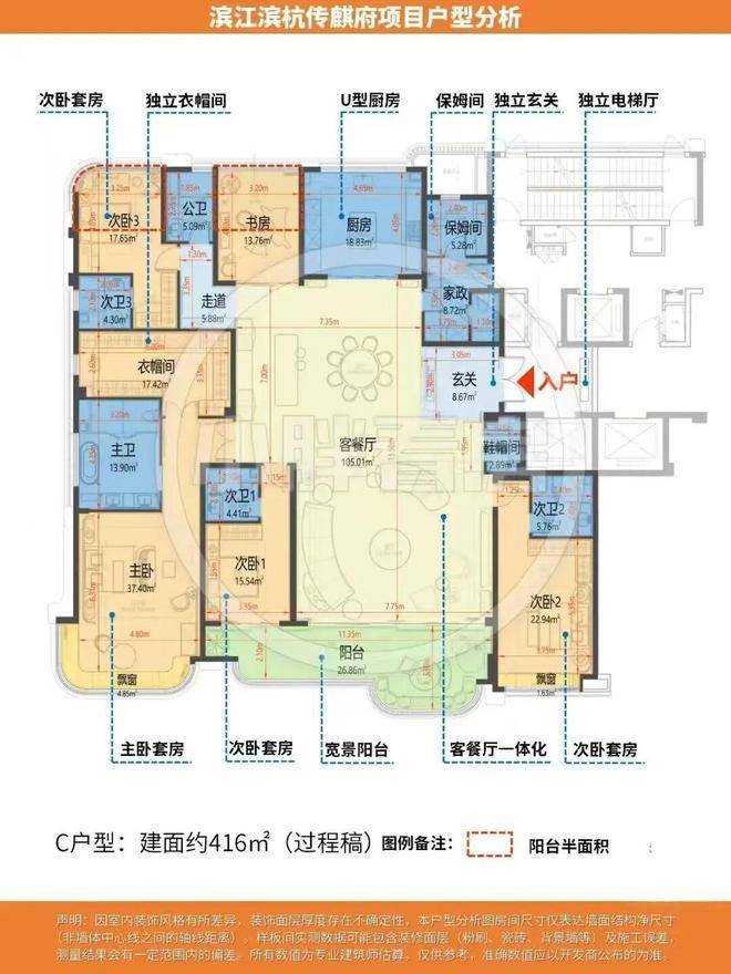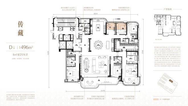主入口大门高约9.5米,公区规划有下沉庭院、地下会所、无边泳池、恒温泳池、架空层泛会所、车马院等配置,室内精装包含嘉格纳12-13件、旭格系统门窗、大金空调等。