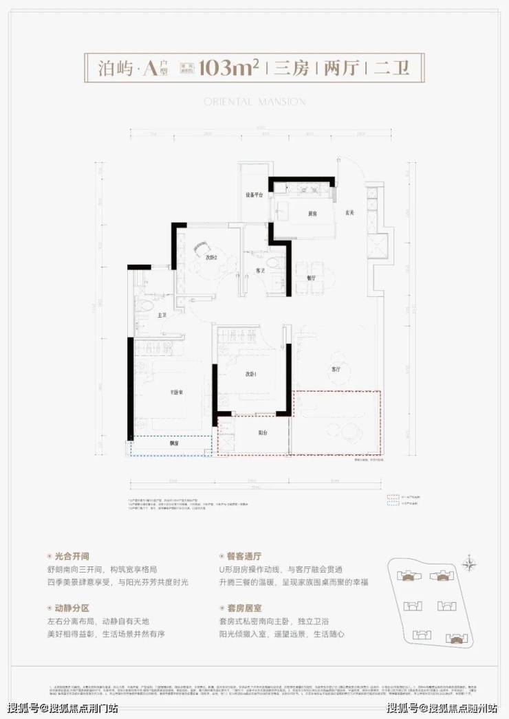 建面约103平,三房两厅两卫。三大亮点分析:① 南向三开间,朝南次卧带阳台,客厅联通阳台后,空间阔绰;② U型厨房且半开放设计,玄关含S墙冰箱位,利用率高、采光更优;③ 新规户型得房率高达约90%以上