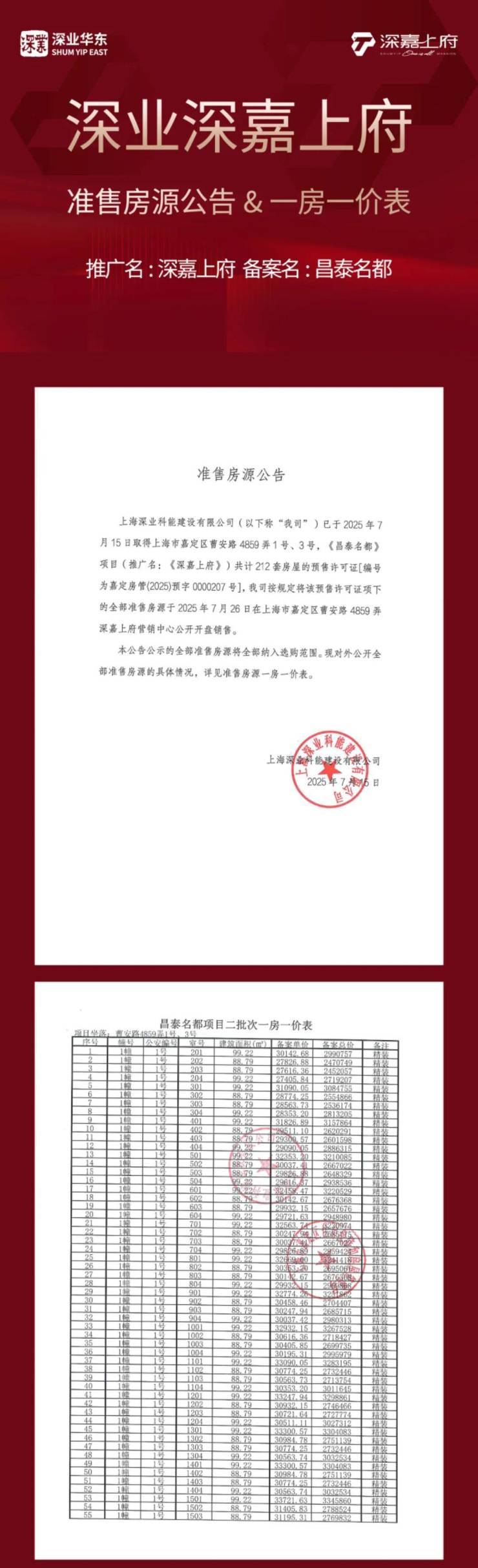 开发商:上海深业科能建设有限公司;推广名:深嘉上府、备案名:昌泰名都;预售许可证号:嘉定房管(2025)预字0000186号、嘉定房管(2025)预字0000207号;本宣传资料为要约邀请,针对本项目概况进行介绍,仅供参考不作为销售承诺。本项目不排除因政府相关规划、规定及开发商未能控制的原因而发生变化,最终以双方签署的正式《上海市商品房预售/销售合同》及其他相关协议文本为准。代理商:同策房产咨询集团股份有限公司、上海世联房地产顾问有限公司。发布日期:2025年07月,有效期3个月。广告/示意图