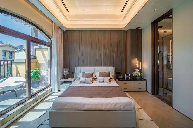 我们看到,建面约212方大户型主卧还有媲美宫殿的“穹顶式”天花板,尺度感、舒适度都让人叹为观止。