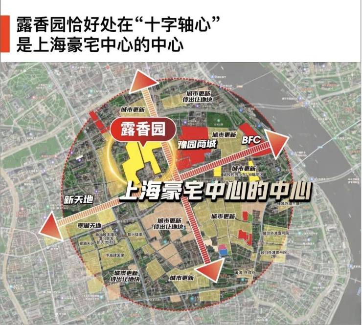 作为上海绝对市心,露香园直线距离人民广场、淮海路、新天地、外滩、豫园等上海市地标性区域均不超过1.5公里,距离陆家嘴直线约2公里。