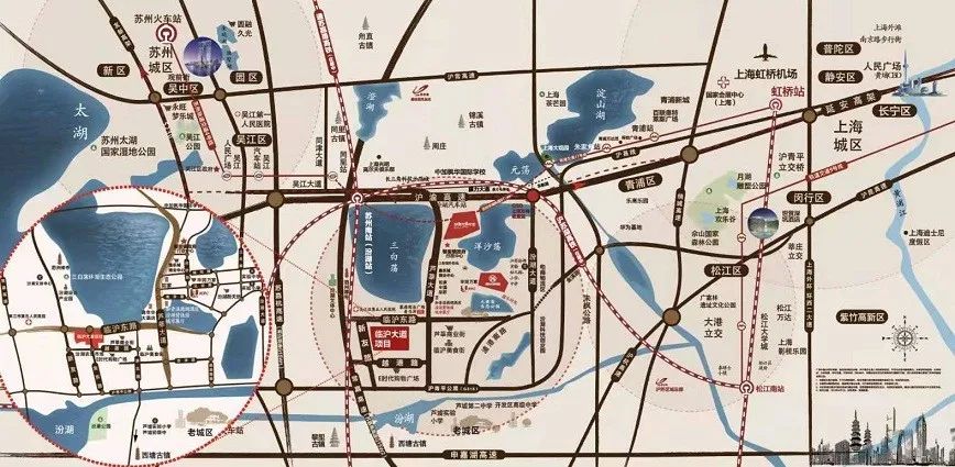 国风·云樾地处吴江汾湖高新区, 而汾湖作为苏州城区接轨上海的排名前列门户,坐拥“苏州桥头堡虹桥副中心”的发展定位,早已在交通、科创、商业、产业、教育、人文、旅游、人居等维度做好长三角一体化国家战略发展先导区的准备;沪苏湖高铁、通苏嘉高铁,十字共站设站汾湖,届时汾湖与虹桥之间的时间距离将缩短到20分钟,从汾湖前往上海松江南站也只有1站的距离;