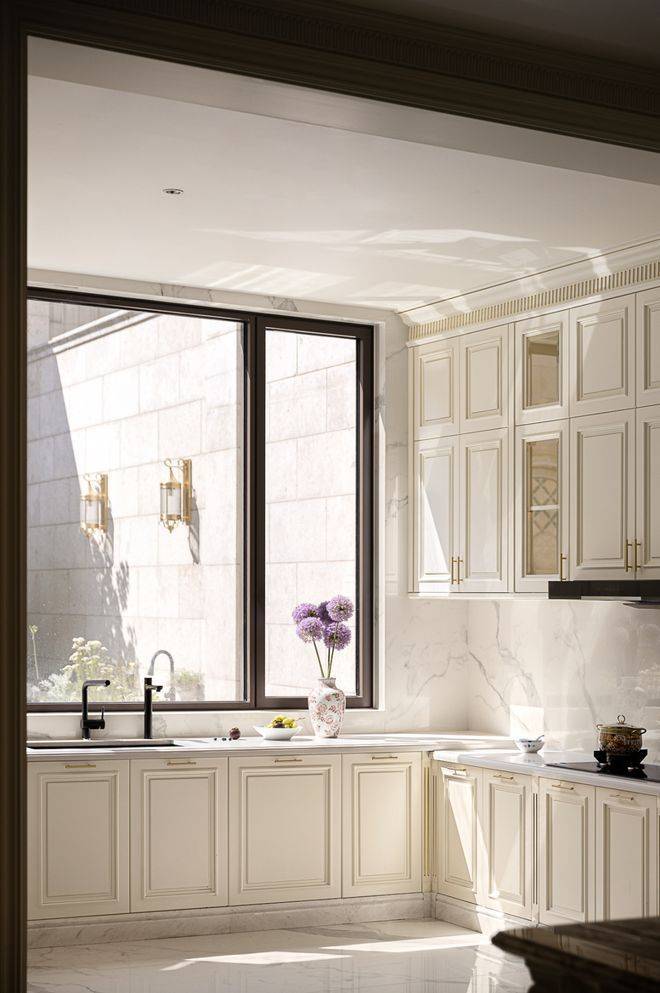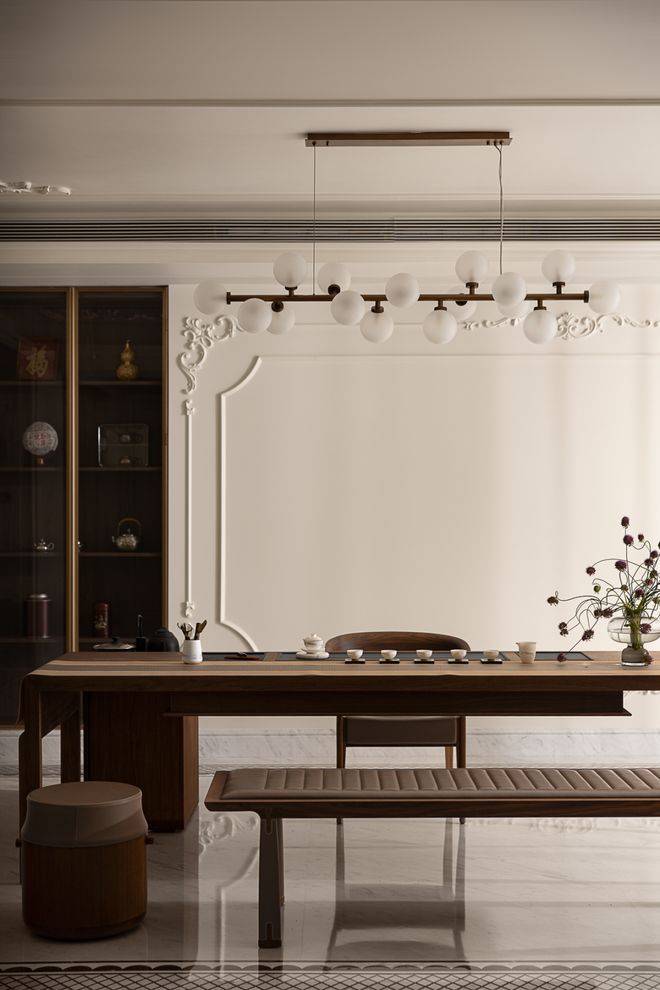 餐厅承载家庭烟火与相聚时光,延续法式轻奢风格,细节暗藏巧思:别致吊灯、餐桌雕花或墙面艺术画,让用餐不再是简单饱腹,而成为充满仪式感的家庭聚会。