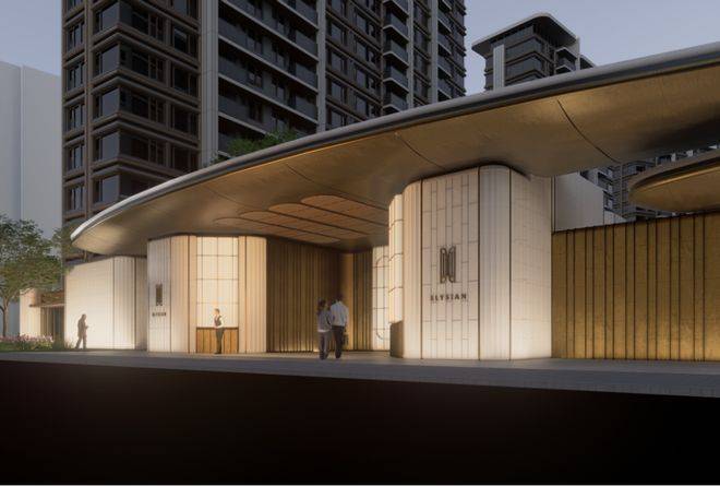 蓝灰色玻璃+仿石铝板+艺术涂料材质,穿插优雅线条,让建筑这张“脸”看起来更高级。One&Only酒店式门头。用雕塑体块、温润弧面和雅致线条,营造具有艺术格调的归家仪式感。