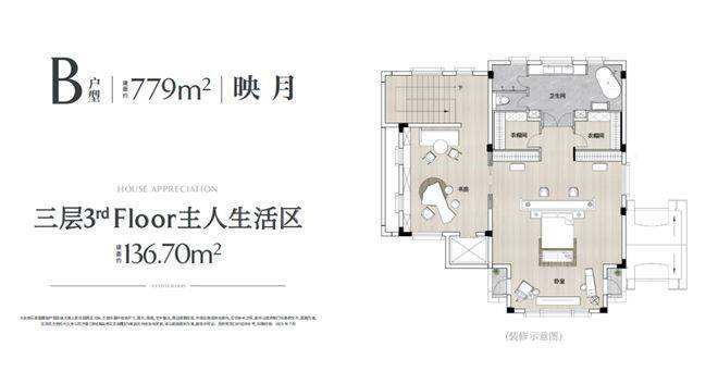 ※二层、三层可实现最多6个卧室套房的设计,做到家庭成员平权,满足多代同居的世家门第。不仅有子女套房+长辈套房,还有足足136㎡的总统级主人套房,涵盖大露台+卫生间+双书房+男女主人双独立衣帽间+休息室等。