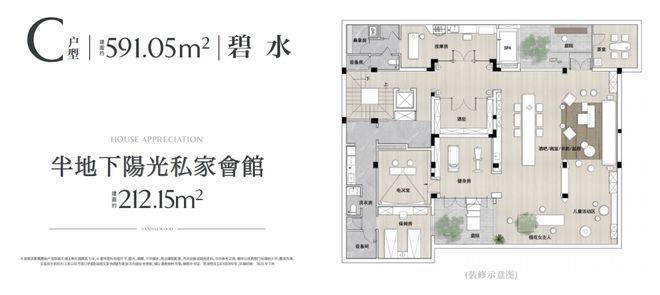 约212㎡的全功能半地下会馆,容纳下会客厅、健身房、桑拿房、恒温酒窖、艺术品收藏室、私家影院、K歌房、保姆房等等,各种流行或者小众的兴趣嗜好,都能在此安放。