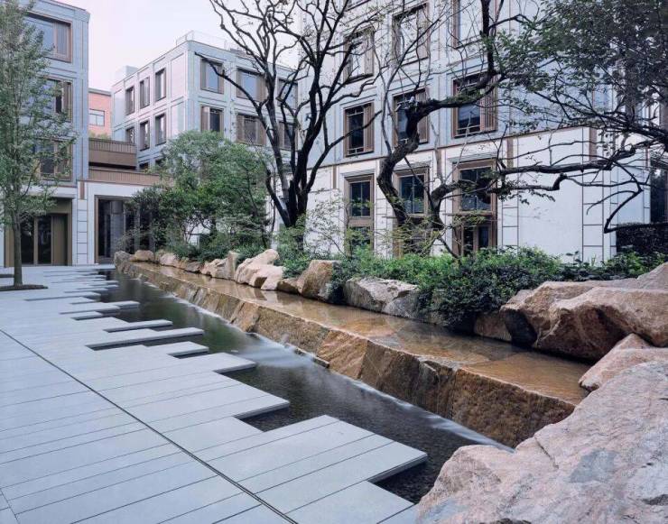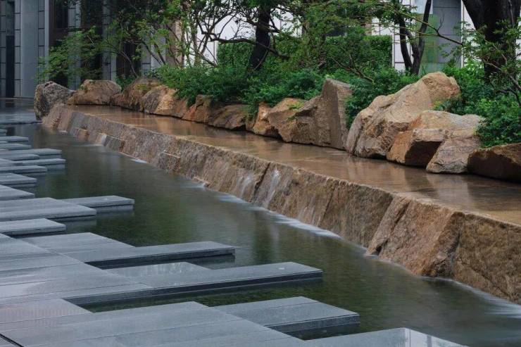 与此同时,植物并非被简单安放,而是仿佛从石隙间自然溢出,攀附、蔓延,轻轻触及水岸。它们柔化了石头的边界,也模糊了人工与自然的界限。景观因此变得有机而生动,如同自然在轻声回应。石的坚毅与植的柔美相互依托,使空间在刚与柔、理性与感性之间不断转换。