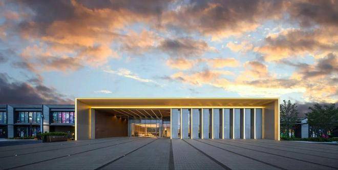 温馨归家,礼迎四方。近33米宽、约6.6米高的社区主入口门头震撼迎客,门头立面采用铝板+蓝珍珠石材干挂工艺,仪式感满满。