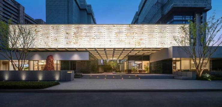 用料上,部分以冰火板+岩板打造的车行道廊柱、仿透光云石定制车牌号、部分主干道全铝板吊顶,无不显示出业主的归家气场。