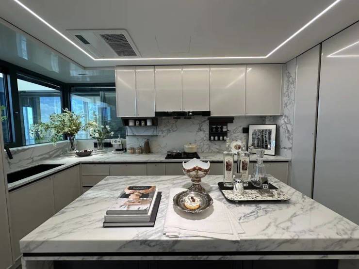 整体动静分区格局。在U型厨房基础上融入 “社交属性”,让烹饪时亦可与客厅家人互动。
