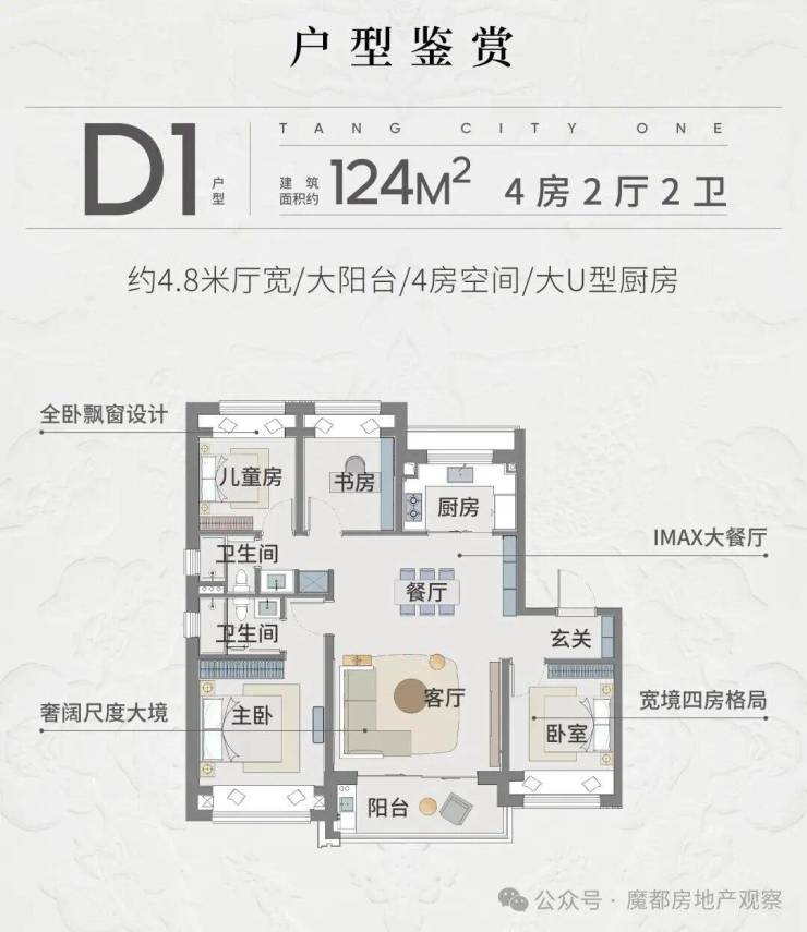 建面约124㎡四房/三房两厅两卫,提供三房、四房两种户型选择,可灵活适配不同家庭结构的居住需求!