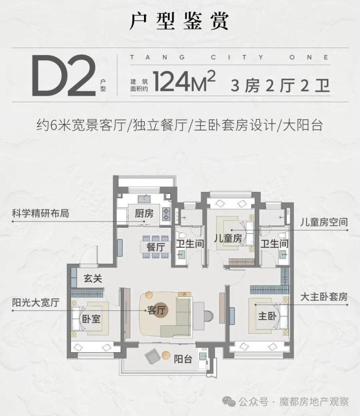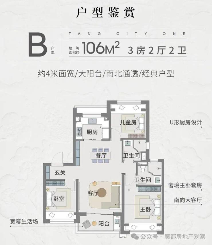 建面约108㎡三房两厅两卫,采用餐客一体一体化布局,约5.4米宽厅搭配南向阳台,打造超广角景观视野,可全方位观赏周边自然与社区景致!