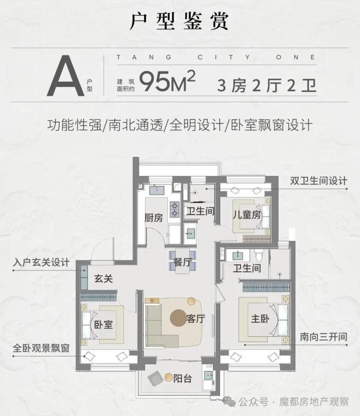 建面约95㎡三房两厅两卫,采用全明成长型户型布局,南向三开间设计实现三面采光,双卫生间配置采用干湿分离工艺,入户玄关打造专属礼仪空间,全卧均配备观景飘窗,最大化引入自然采光与通风,精准适配刚需首置及二人世界家庭的居住诉求!