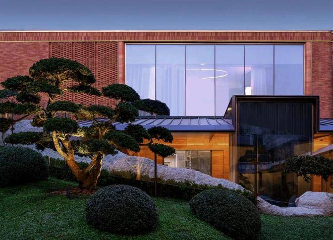 第一重-堂前会客,这里首先营造了满满的社区入户的仪式感,通过红色陶砖与红洞石以及大面落地玻璃营造出了层次丰富的艺术立面。营造业主在家庭空间以外进行接待交往的处所。