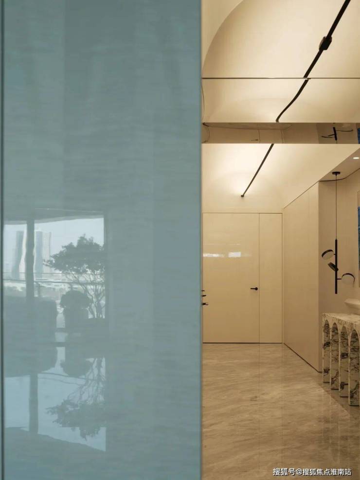 作为入户第一幕,玄关以极简姿态开启生活叙事,素净墙面如天然画布。清透支架托举着素白花瓶,植物姿态俏皮延展,成为连接户外与生活的温柔过渡。