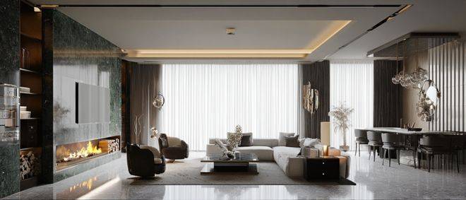 大面宽也营造了更为明媚的家庭公区。约6米宽尺大横厅连接南向空中花园,周末与亲友相聚,阳光倾泻而入,甚至都不需要开启主灯。