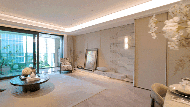 电视背景墙采用卡慕白的石材+皮革造型,弧形吊顶,相当讲究,连空调出风口的形状都打造为海上·清和玺logo山茶花的形状~~三大件为大金(或同等档次)中央空调和地暖,新风系统为百朗(或同等档次),南向阔景阳台,采光视野一级棒!