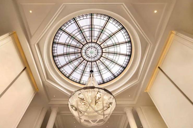 中庭大门设计为“海派光厅”,其玻璃镜面由匠人手工绘制经典海派线条,邬达克经典的纹路设计嵌于表面,同时墙面定制优雅的奢石装饰,整个空间既奢华又富有底蕴。