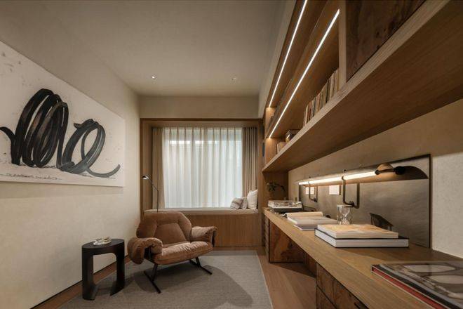 不同于市面上门是门,框是框,墙是墙,看房时“五颜六色”。外滩瑞府室内采用一体化设计语言,实现空间、色彩与材质的协调统一。比如: