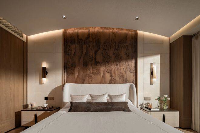 奢材的遴选,是对“权力美学”的深度呼应:玄关处白雪公主玉石,以通透莹润的肌理,像月光倾泻般铺就外滩私邸 “入门即尊荣” 的隐喻;祥云灰水墨岩延展地面的流动诗意,与外滩华尔道夫同源共生;而最为珍稀的,当属主卧背景墙上威尼斯安缦级树瘤木与巴黎宝格丽同源羊皮纸的邂逅——两种天然文明在此对话,营造出一种可被触摸、被感知的官邸奢感。