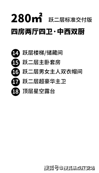 另外还在205㎡产品的大框架上,升级了顶跃280㎡产品,套型设计为四房两厅四卫,跃一层的大体格局与205㎡产品相似,同样的可以独享私家电梯厅入户,独立玄关,公区LDKB一体化设计,不同的是跃一层的公区南向客厅面宽升级到市场上稀缺的11.4米。公区可拓展功能空间变得更自如,可扩展区域完全可以当做一个完整的南向卧室使用。厨房同样做到了中西双厨设计,厨房与家政空间联动,空间利用率高。另外私区打造南向双主卧套房,私密性更强,层高做到了3.15米。跃一层楼梯下还可作为临时储藏使用。