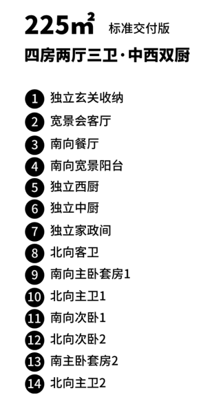 通过产品预研,企业可以更好地把握市场机会,减少开发风险,提高产品的竞争力。以本案定制化“一层一户”主力产品205㎡大平层户型为例,套型设计为四房两厅三卫,独享私家电梯厅入户,独立玄关,公区LDKB一体化设计,8.1米宽横厅,定制化设计创新中西双厨设计,可承载更多的生活方式,厨房与家政空间联动,空间利用率高,仪式感更强,生活更自如。私区打造南向双主卧套房,私密性更强,层高做到了3.15米。