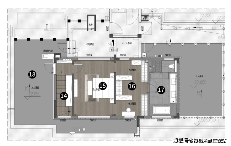 跃二层则是超级豪华的主卧套房,约20㎡男女主人双衣帽间,主卫超长双台盆、独立淋浴间与马桶间、浴缸超豪华五件套配置。还有私享顶层露台花园,增加尊贵感与私密性。