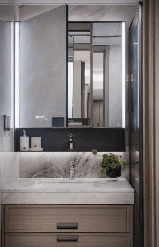 主卫生间配备了智能化的魔镜,该镜面为双面高清设计,内置美妆冰箱功能的镜柜以及卫浴柜,能够实现恒温冷藏。主墙面装饰采用了耐用的岩板材料,内部设计考虑周到,特别预留了四个电源插座,方便电动牙刷、卷发棒以及吹风机等个人护理电器的使用和收纳,同时设有洗脸巾的抽取装置。