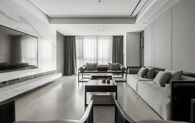 电视墙很长,用石材+护墙板做分段装饰,简单、有质感。