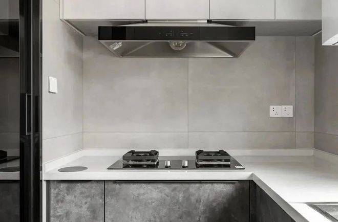 瓷砖通铺到厨房,用了同色系的灰调柜门,简单干净易打理。