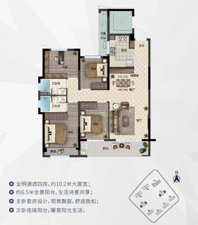主力户型:80-125㎡(2-4居),含80㎡两居、101-113㎡三居、125㎡四居,全明格局设计