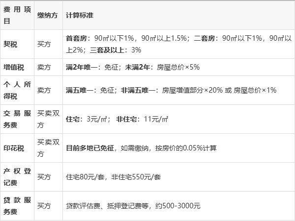 房屋买卖涉及的税费因地区和政策不同,以下是一般情况下的收费标准: