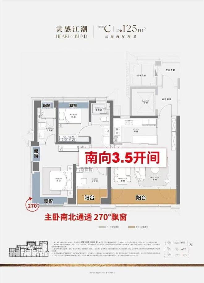 南向3.5开间+双阳台+270°转角飘窗,让该户型的采光性能、空间通透感几乎做到极致!