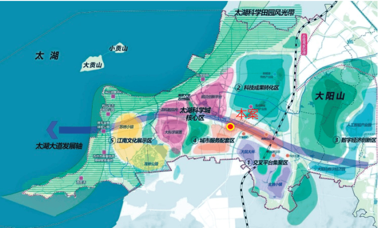 本案位于太湖大道发展主轴上,占位城市服务配套区,串联新区行政中心、文体中心、时尚水岸商业街、科技城医院、南大、太湖等现有资源。
