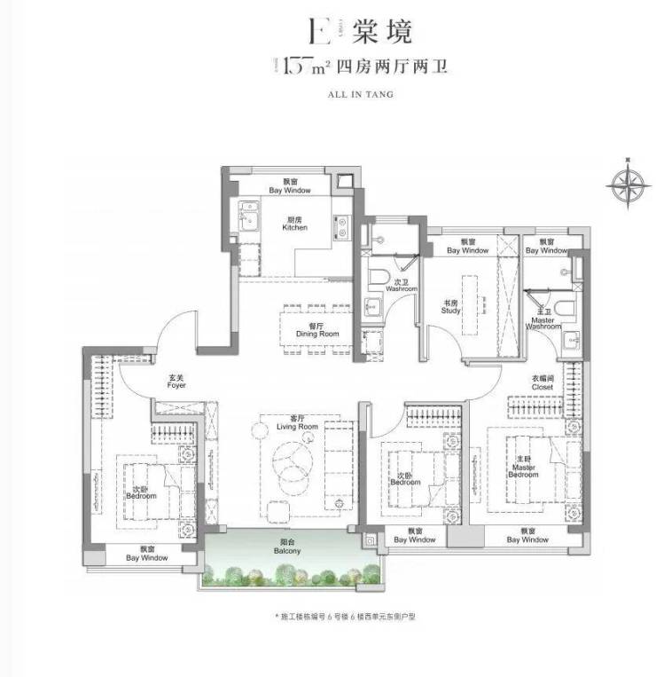 建面约105㎡3房2厅2卫,做到了三开间朝南+4个飘窗+双面阳台系统+主卧套房设计+270°转角飘窗,该户型的居住体验、舒适度、尺度感,是同级别产品所无法比拟的。