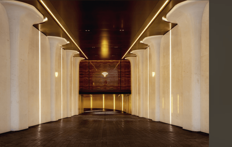 在门庭的环岛空间,景墙面采用中轴对称的设计布局,定制了奢石镶嵌装饰,将曲面艺术与经典石器之美圆融交融。