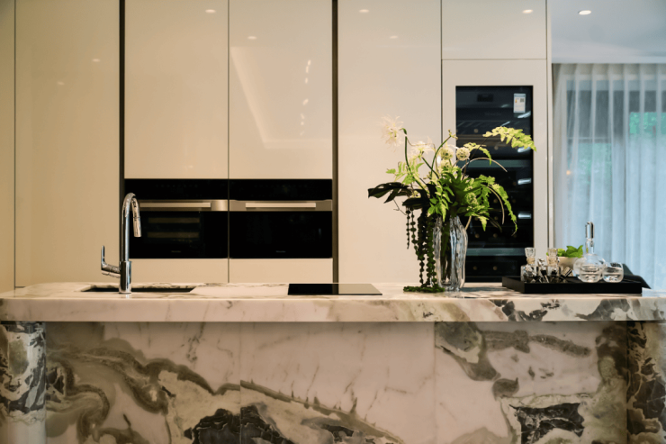 这次新开的建面约315㎡样板间由LSD大师设计团队,在装修方面可谓诚意满满,从地面到墙面到壁龛都是石材,提升居住整体的格调,配置了 十件套厨房家电,甚至酒柜!