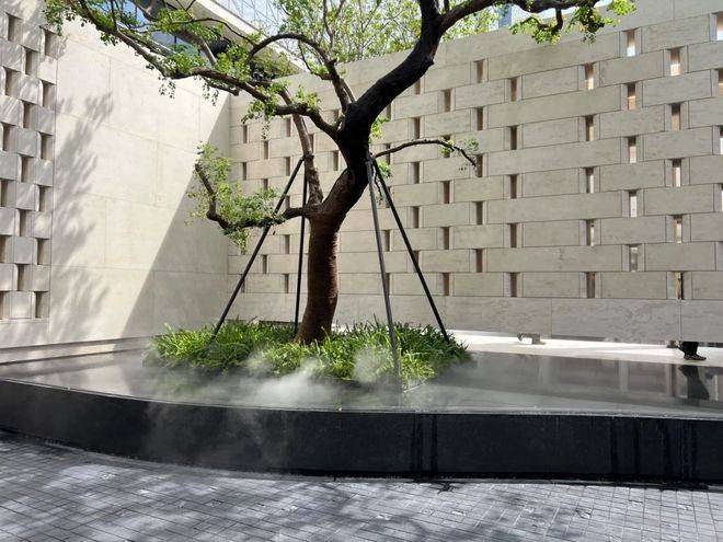 园林设计上则更偏酒店化,以希腊安缦卓熠为灵感,整个核心区园区以约900方的无界中央水景为主体。穿过大门后,约900㎡的无边界水景豁然眼前,建筑、回廊与树丛仿佛凌波而立。正如“美人在骨不在皮”,无需繁复修饰,大尺度空间、开阔水院与大面积玻璃自成画布,任自然光挥洒,这才是内蕴的性感。最是没的是在11号楼架空层的邻里中心——窗沿与水院浑然一体,桌案几乎与水面持平,微风拂过,涟漪便从眼前漾开。庭院里的丛生乌桕,不事雕琢,保留原生枝条的疏朗与错落,尽显自然之美。