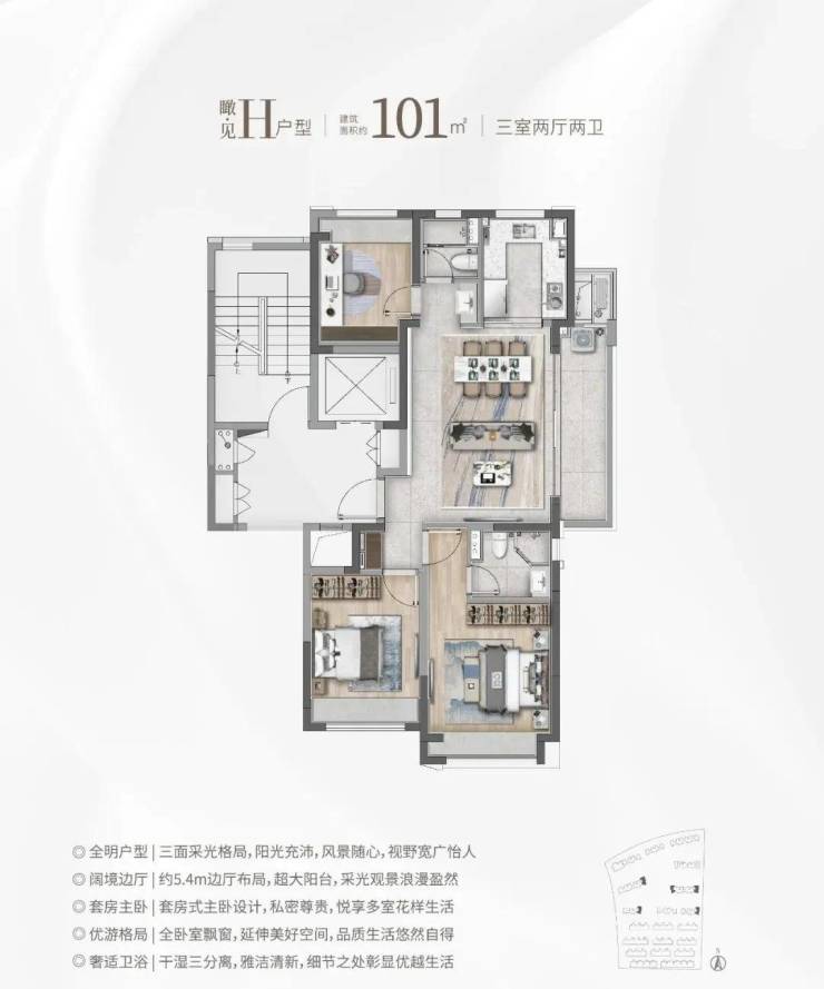 ②建面约101㎡H户型:三面采光,全能景观王炸边厅户型!