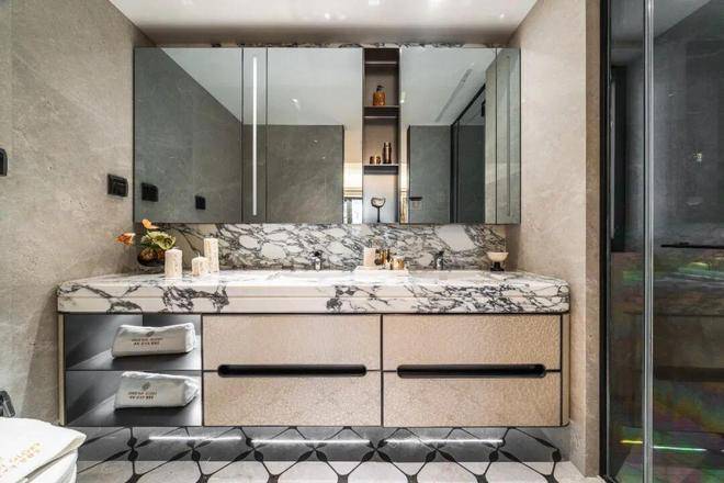 交付标准上,公区80×80cm大理石通铺,以大面积石材的厚重感彰显格调,且无缝拼接工艺大幅降低清洁难度;卧室则采用海派鱼骨拼花地板,用木质肌理的温润感营造私域氛围。这种“公区显质感、私域藏温度” 的材质分区逻辑,正是高端住宅的设计精髓。